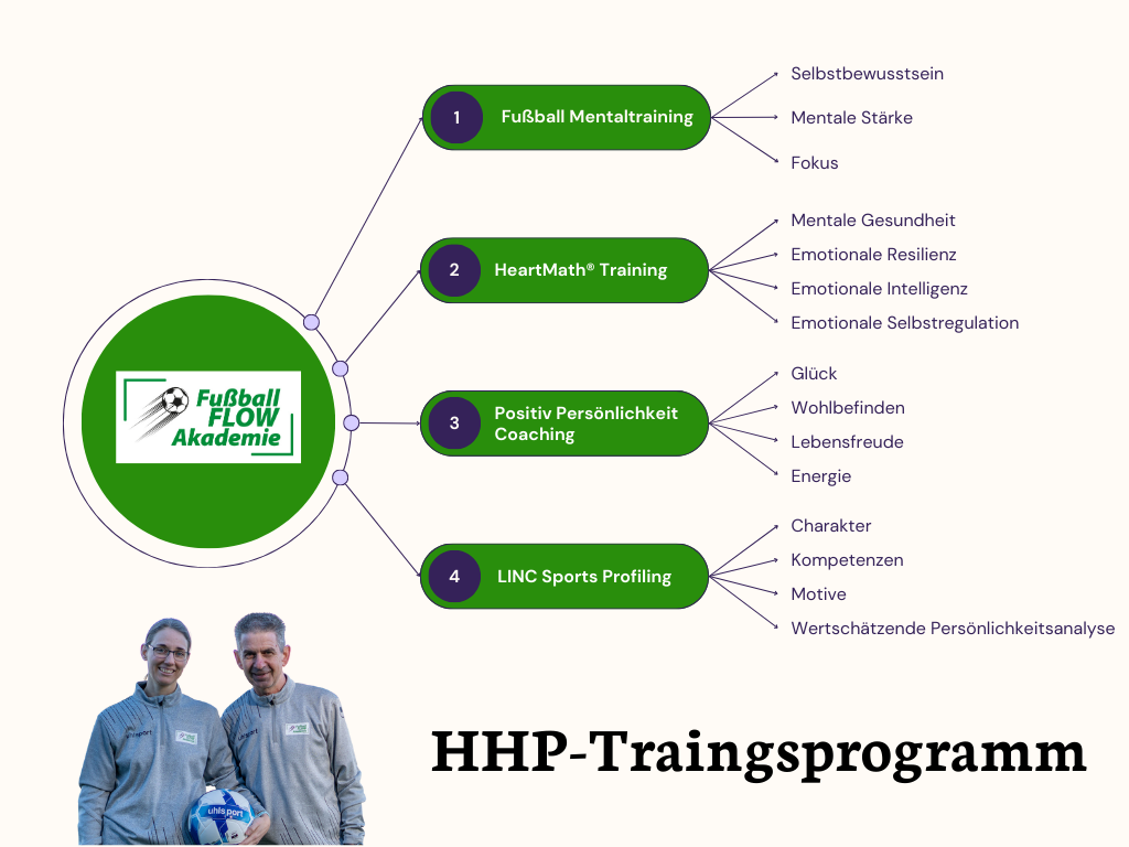 Unser einzigartiges Programm „LEBENSFLOW-Der kleine Vorsprung“ bietet dir ein komplettes Coaching für deine inneren Kräfte Herz, Hirn und Persönlichkeit. Wir helfen dir mit wissenschaftlich erprobten Methoden zu Höchstleistung, Gesundheit und Alltagsglück auf und neben dem dem Platz. Durch die Kombination aus hochmodernem HeartMath-Training, ganzheitlicher Gesundheitsprävention und intensiver Persönlichkeitsentwicklung schaffen wir die Basis für mentale Unbesiegbarkeit und physische Bestform. Wir bilden nicht nur technisch versierte Fußballer aus, sondern formen reflektierte, belastbare Persönlichkeiten, die den modernen Anforderungen des Profifußballs gewachsen sind. Unser Ziel ist dein Flow: der Moment, in dem Talent, Gesundheit und Mindset eins werden.